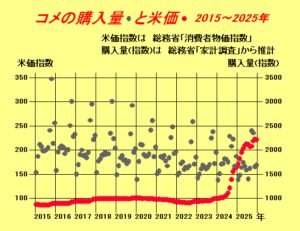 最近の政府統計をみると、国民のコメに対する執着が見てとれる。昨2025年12月の米価は、1年半前の2倍に高騰したが、国民の購入量は、ほとんど減らなかった。だから、掛け算した購入金額は2倍になった。