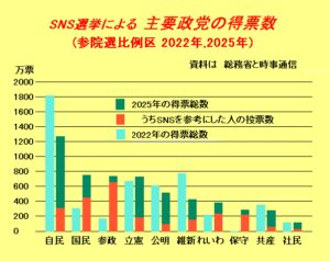 ここには明らかな因果関係がある。つまり、SNSなどの広報活動に多くを注力した政党は、それが増幅されて得票総数が増えたように思われる。