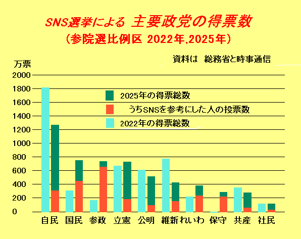 この図は、7月の参院選の比例区について、主要な政党ごとの得票総数と、その内わけの、SNSを投票の参考にした人数である。