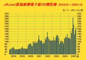 最近の閲覧数は、毎月200万件を超えている。これは、農業界の新聞のHPとしては、ダントツである。また、地方の中堅の一般新聞のHPと比べると、やや少ない、という程度の閲覧数である。本HPの閲覧数が、これらと肩を並べられる日が来るのは、それほど遠くないだろう。
